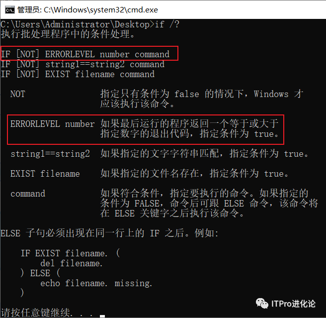 errorlevel 用来判断上条命令的返回值,在 if ? 语句的帮助文档中有说明,如下图: