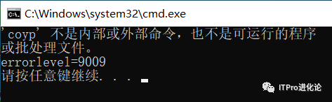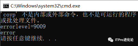 if %errorlevel%==0是判断errorlevel是否等于0,因为errolevel的值等于9009,所以执行了echo error,当把命令改成if %errorlevel%==9009时,输出了success。
