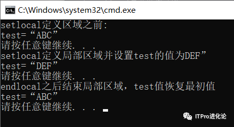 在setlocal定义的局部区域,设置了test=“DEF”,当通过endlocal结束定义的局部区域后,test的值恢复成最开始设置的“ABC”。