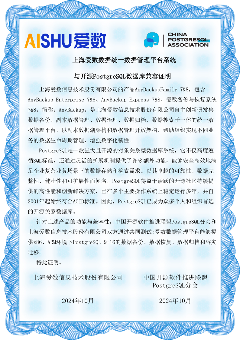 近日,中国开源软件推进联盟PostgreSQL分会和上海爱数信息技术股份有限公司通过共同测试,证明爱数数据管理平台能够提供x86、ARM环境下PostgreSQL 9-16的数据备份、数据恢复、数据归档和容灾迁移。此次认证为国内开源数据库技术应用提供了更为安全可靠的保障!