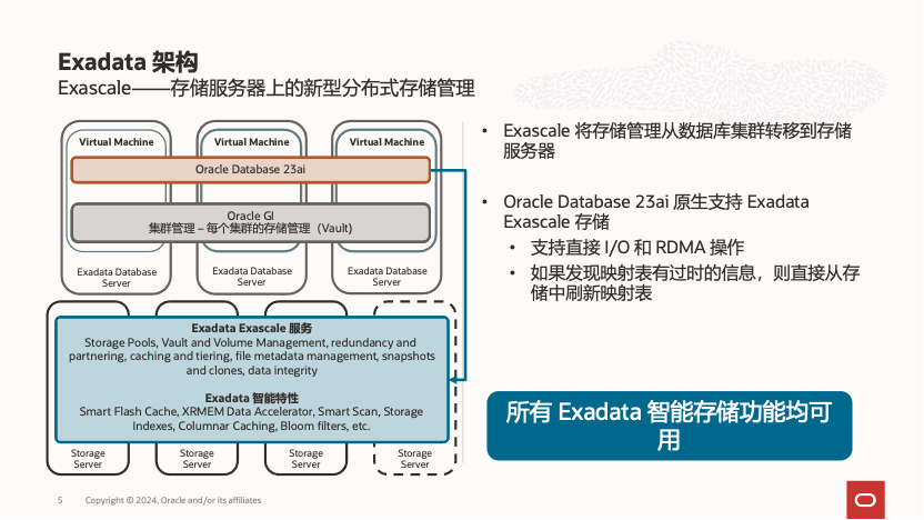 正是基于这些原有Exadata部署vm的限制,在ESS 24引入了全新的也是全球独特的Oracle数据库智能存储架构Exascale,其架构如下: