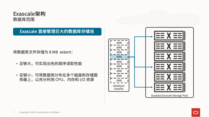 从这张图可以看出,相较于传统基于 ASM 和 Diskgroup 的存储管理,新架构将所有存储管理工作都转移到 Exadata 智能存储层,不再依赖 ASM 和 Diskgroup,而是通过一个专用于数据库的共享分布式文件系统直接提供给 RAC 使用,同时保留了所有 Exadata 智能软件针对数据库的加速特性。在 Exascale 架构中,存储层而非数据库节点直接管理庞大的存储资源池,为数据库提供服务。