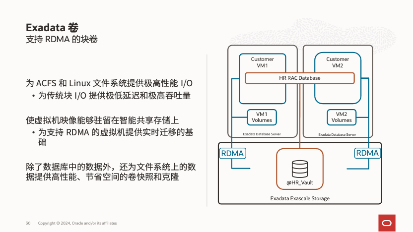 Exascale在保持Exadata针对Oracle数据库优化的性能之上,额外提供更好的灵活性,简化 Exadata 存储管理和分配,将存储管理从数据库集群转移到存储服务器;和数据库结合的灵活的快照克隆技术也在保持Exadata性能的同时为CI/CD需要的测试开发数据库提供了方便灵活的解决方案;同时在存储层面也提供了给非Oracle数据库使用的基于RDMA的高性能块设备,解决原有Exadata VM Cluster数量受限于计算节点本地盘的限制。