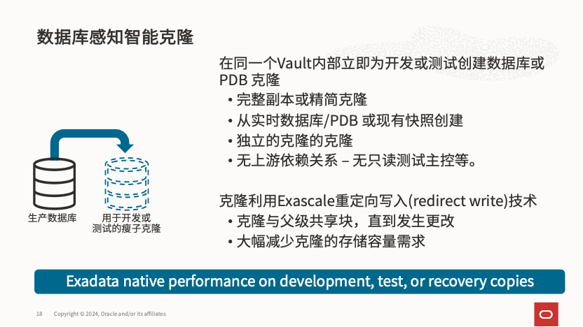 在 Exascale 中,不再需要将被快照的数据库设为只读,通过一条或几条简单的命令就可以在同一 Vault 内创建生产库和容灾库的可读写快照克隆,为测试和开发提供便利。而且,各个克隆之间的刷新过程完全独立,彼此没有依赖关系。