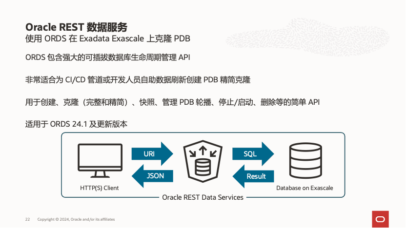 借助 Exascale 的写重定向快照克隆技术,可以显著节省存储空间。仅需生产数据库存储容量的几分之一,甚至十几分之一,即可创建多个数据库克隆,大幅降低成本。为了更好地支持 CI/CD 流程,Exascale 还提供了基于 REST API 的接口,方便与 CI/CD 环境集成,实现更高效的自动化流程。