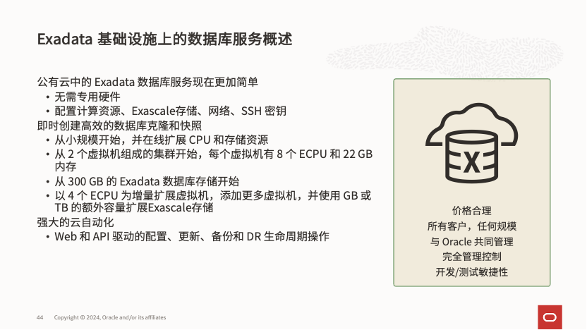 4) 基于公有云服务的 Exadata DB Cloud Service 起步就需要独占硬件节点,虽然避免了不同租户之间的干扰,但最低配置为 2 个计算节点和 3 个存储节点,导致门槛较高。采用Exascale上的Exadata DB service服务,就可以在满足传统应用和生态工具访问数据库所在操作系统的需求同时,无需独占的硬件节点,降低起步成本。