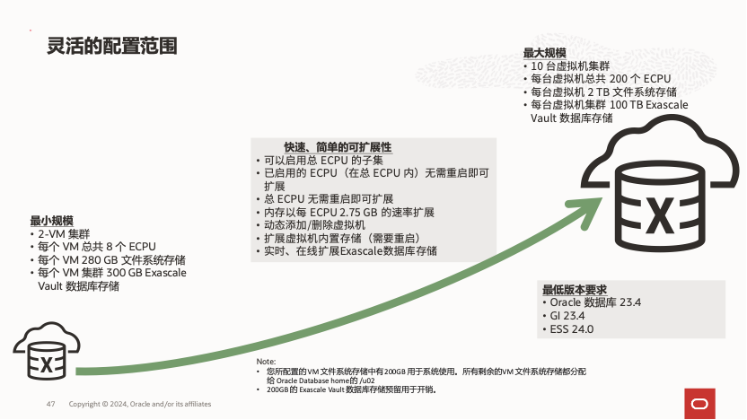 公有云上的 Exadata DB Service on Exascale 大大降低了在公有云中使用 Exadata 的门槛。用户不再需要独占计算和存储节点作为起步条件,最小配置仅需 2 个虚拟机组成的集群,每个虚拟机配备 8 个 ECPU、22 GB 内存和 300 GB 的 Exadata 数据库存储。计算能力可按 4 ECPU 的增量进行扩展,存储资源则以 GB 为单位灵活增加,为用户提供了更灵活的选择空间。