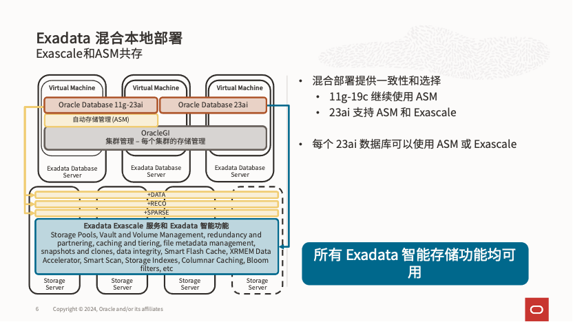 Exascale 架构的变革也要求 Oracle 数据库做出相应调整,因此 Exascale 仅支持 Oracle 数据库版本 23ai。对于本地部署的 Exadata,可以采用 Exascale 与传统 Exadata Griddisk/ASM 组合部署的方式,从而支持 19c 数据库版本。