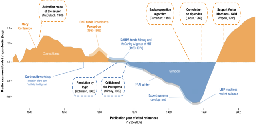 如下图所示,连接主义流派首先伴随 AI 概念诞生而产生,但是遇到瓶颈而推动了符号主义发展。两个流派此消彼长,也已将近几十年。