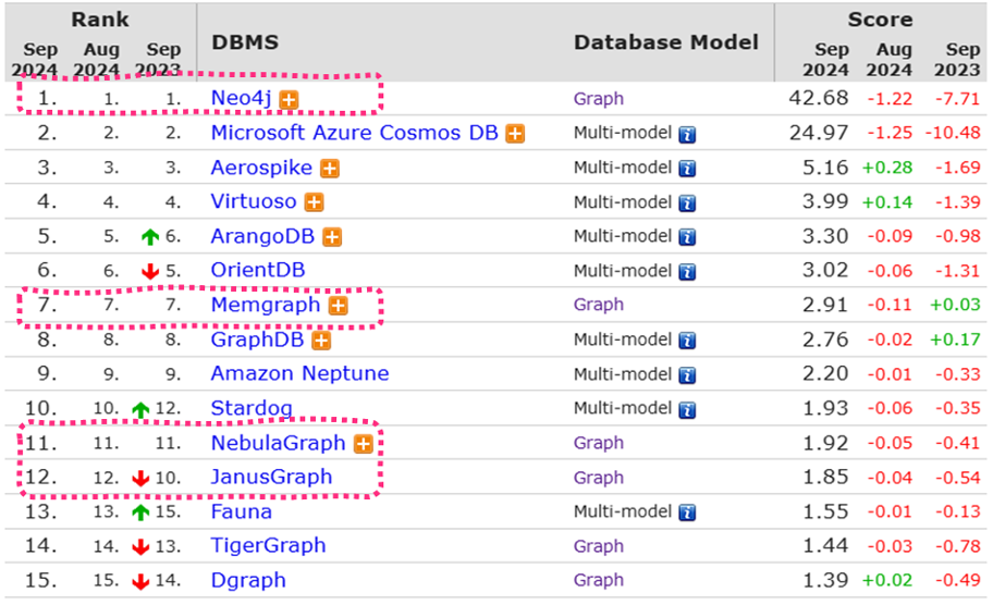 既然选择了 GraphRAG 路线,首先要解决的就是图数据库的选型。首先选择了 DB-Engines Ranking 的列表作为备选产品列表。