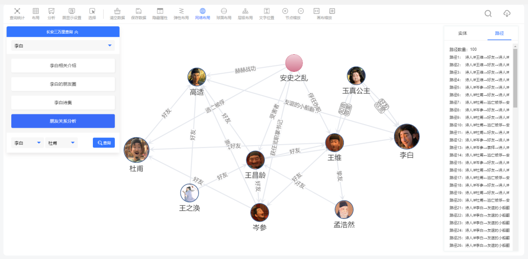点击朋友关系分析,我们选择“李白”与“杜甫”,就可以查看杜甫与李白间千丝万缕的关系。