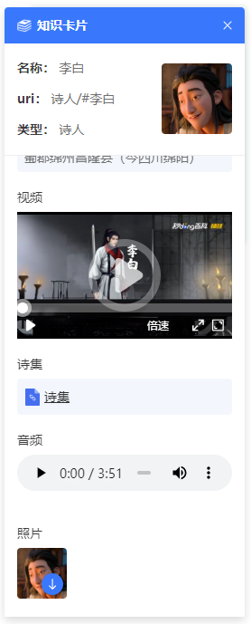 在DEMO中,我们特别设计了知识卡片功能,它能让你更直观地了解每位诗人的生平、视频及音频介绍、照片及诗集下载等丰富内容,让你在视觉和听觉上都能感受到那个时代的文化韵味。