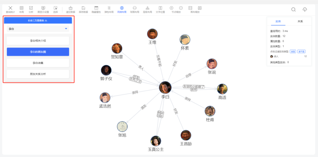告别复杂的代码和查询语句,我们的DEMO提供了一键查询的便捷操作。无论是李白的介绍、朋友圈、诗集,还是朋友关系分析,只需一键点击,即可按需选择,轻松获取所需信息。