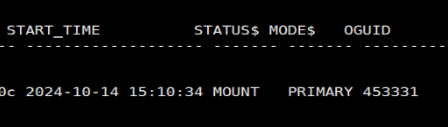 [dmdba@localhost monitor]$ dmmonitor dmmonitor.ini[monitor] 2024-10-14 23:40:32: DMMONITOR[4.0] V8[monitor] 2024-10-14 23:40:33: DMMONITOR[4.0] IS READY.[monitor] 2024-10-14 23:40:33:#-----------------------------------------------------------------------------------------------#GET MONITOR CONNECT INFO FROM DMWATCHER(RW1), THE FIRST LINE IS SELF INFO.DW_CONN_TIME MON_CONFIRM MID MON_IP MON_VERSION2024-10-14 23:40:31 TRUE 1999360674 ::ffff:192.168.xx.208 DMMONITOR[4.0] V8#-----------------------------------------------------------------------------------------------#[monitor] 2024-10-14 23:40:33: Received message from(RW1)WTIME WSTATUS INST_OK INAME ISTATUS IMODE RSTAT N_OPEN FLSN CLSN2024-10-14 23:40:31 STARTUP OK RW1 MOUNT PRIMARY NULL 8 45015298 45015298[monitor] 2024-10-14 23:40:33: Received message from(RW2)WTIME WSTATUS INST_OK INAME ISTATUS IMODE RSTAT N_OPEN FLSN CLSN2024-10-14 23:40:30 OPEN OK RW2 OPEN PRIMARY VALID 8 45047073 45047073show2024-10-14 23:40:48#================================================================================#GROUP OGUID MON_CONFIRM MODE MPP_FLAGGRP1 453331 TRUE AUTO FALSEGROUP SPLIT:1: DATABASE(RW2):<<DATABASE GLOBAL INFO:>>DW_IP MAL_DW_PORT WTIME WTYPE WCTLSTAT WSTATUS INAME INST_OK N_EP N_OK ISTATUS IMODE DSC_STATUS RTYPE RSTAT192.168.xx.207 62141 2024-10-14 23:40:44 GLOBAL VALID OPEN RW2 OK 1 1 OPEN PRIMARY DSC_OPEN TIMELY VALIDEP INFO:INST_IP INST_PORT INST_OK INAME ISTATUS IMODE DSC_SEQNO DSC_CTL_NODE RTYPE RSTAT FSEQ FLSN CSEQ CLSN DW_STAT_FLAG192.168.xx.207 5236 OK RW2 OPEN PRIMARY 0 0 TIMELY VALID 3453762 45047237 3453762 45047237 NONE2: DATABASE(RW1):<<DATABASE GLOBAL INFO:>>DW_IP MAL_DW_PORT WTIME WTYPE WCTLSTAT WSTATUS INAME INST_OK N_EP N_OK ISTATUS IMODE DSC_STATUS RTYPE RSTAT192.168.xx.206 62141 2024-10-14 23:40:45 GLOBAL SPLIT STARTUP RW1 OK 1 1 MOUNT STANDBY DSC_OPEN TIMELY INVALIDEP INFO:INST_IP INST_PORT INST_OK INAME ISTATUS IMODE DSC_SEQNO DSC_CTL_NODE RTYPE RSTAT FSEQ FLSN CSEQ CLSN DW_STAT_FLAG192.168.xx.206 5236 OK RW1 MOUNT STANDBY 0 0 TIMELY INVALID 3447215 45015298 3447215 45015298 NONEDATABASE(RW1) APPLY INFO FROM (RW2), REDOS_PARALLEL_NUM (1), WAIT_APPLY[FALSE]:DSC_SEQNO[0], (RSEQ, SSEQ, KSEQ)[3447215, 3447215, 3447215], (RLSN, SLSN, KLSN)[45015298, 45015298, 45015298], N_TSK[0], TSK_MEM_USE[0]REDO_LSN_ARR: (45015298)