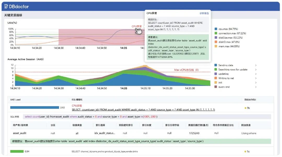 DBdoctor首创的SQL性能审核功能,可重点解决代码开发阶段SQL性能无法真实评估的难题,创新性地提出基于eBPF技术的外置Cost优化器方案。无需在生产环境中执行SQL,即可准确预测其在生产环境中的性能表现,并提供全局最优索引,提前规避故障发生。