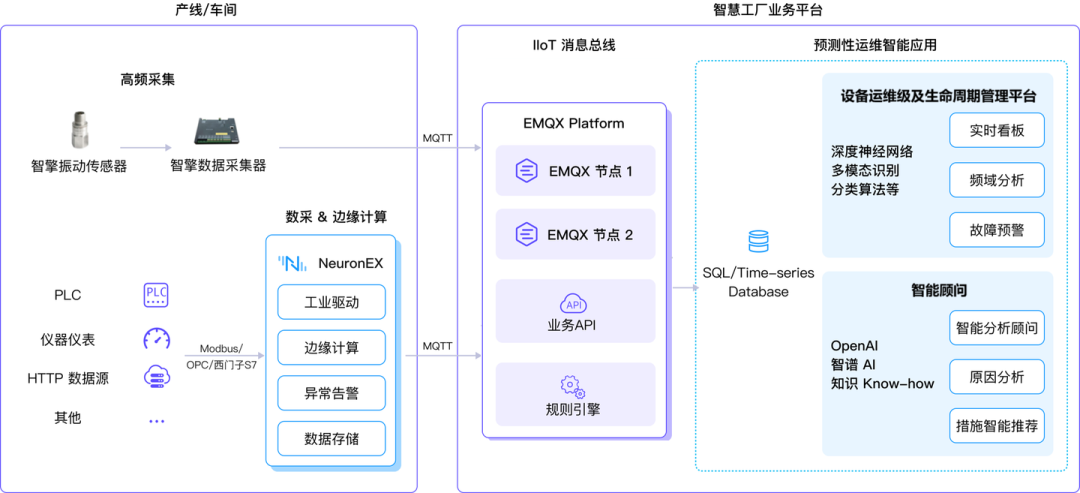 EMQ 通过云边协同方案为该基地构建工业物联网平台,具备工业设备数据采集、边缘计算、海量数据并发、高频数据储存的能力,为设备预测性运维平台提供了高频高精度物联数据感知、边缘算法融合、实时传输、高效存储、集成算法的数据基座。EMQ 为该食品生产企业提供工业协议网关软件 NeuronEX ,内置 80+ 工业协议, 支持对各类工业设备温度、振动、压力等测点进行数据采集,并通过轻量级 MQTT 协议传输,实现在工业生产弱网环境下的各类数据实时感知与稳定传输。此外,NeuronEX 还具备 100 ms 级高频数据采集的能力,通过可视化配置实现数据统一命名、统一规范,为设备预测性运维提供高质量数据。NeuronEX 具备边缘数据流式计算、AI 算法集成及优化、边缘侧数据存储等能力,可以在近设备端低延时实现数据清洗、设备异常告警、特征值提取、参数调优等智能化场景,降低平台侧 AI 算法模块的数据处理压力,提升预测性运维算法及模型训练的实时性和准确性。企业级 MQTT 消息接入平台 EMQX Platform 支持集群化部署,为海量、高频率采集工业设备数据提供高可用、高并发、低延时、安全可靠的数据传输、处理、集成能力。EMQX 可支持将实时采集数据以每秒超 10W TPS 的性能写入关系数据库或时序数据库,为预测性运维构建高精度的历史数据资产。