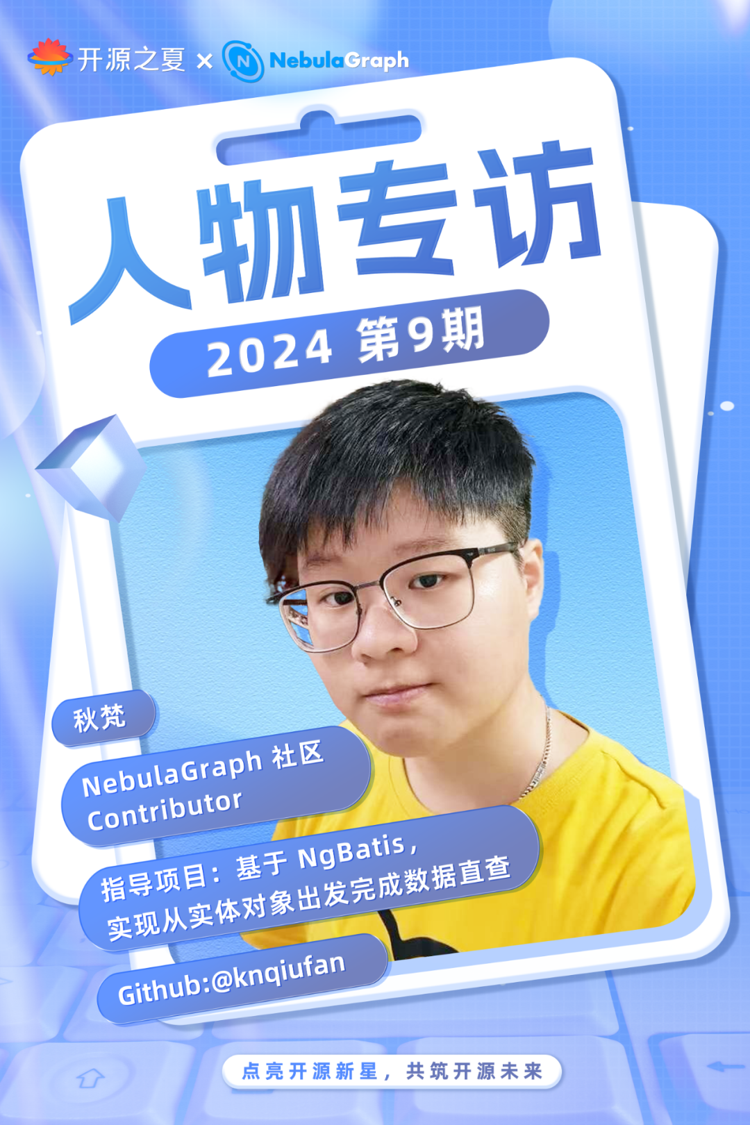 OSPP:请介绍一下您在开源之夏 2024 中指导的项目。秋梵:我指导的项目是基于已有的 NgBatis 开源框架,用另一种方式来实现数据查询等操作。也就是对于图数据的操作从原来的利用编写接口的方式,扩展出直接从实体对象出发来完成对图数据的增删改查,让框架在使用上体现出图的特点,用更贴合图的思维方式来操作数据。NgBatis 是一个基于 SpringBoot 开发的针对 NebulaGraph 的图数据库关系映射框架,所以这个项目其实不算很难,对于需要掌握的技术栈来说,只需要掌握 SpringBoot 的基本原理和 NebulaGraph 的基本操作,以及对 NgBatis 的使用有所了解,就能做这个项目的开发。当然最重要的还是实现思路,这就需要学生能够正确的理解项目的意图和其中的思想了。OSPP:您设置该项目的考虑是什么?项目产出有什么实际意义?该项目成果将为 NebulaGraph 带来什么?秋梵:当前的 NgBatis 还是太“ORM”了,我们希望它更像“OGM”。作为一个图数据库关系映射框架,当前所使用的开发思维方式却还是操作关系型数据库的思维,在使用上更像操作一张“表”而不是一张“图”,这总感觉存在着那么一丝丝不协调感。图数据库有自己的优势和特点,特别实在关系的表达上。那么既然 NgBatis 是针对 NebulaGraph 的图数据库的关系映射框架,我们希望它也能体现出图的特点和优势。我们想消除那么一丝丝的不协调感,让 NgBatis 在开发和使用上更丝滑,更贴近图的操作。所以就有了这个项目。OSPP:开源之夏 2024 结项在即,项目开发是否顺利进入尾声?期间有什么挑战经历吗?秋梵:目前项目的发展还是比较顺利的,学生很聪明也很棒,在开发过程中会陆陆续续的提出自己的见解,以及一些开发或是思路上的问题,我也会针对这些问题与学生保持着一定频次的交流讨论,学生当下也已经提交了相关 PR。都说“万事开头难”,确实在做项目的初始阶段我们花了比较多的时间去理解整个工程代码,和对项目的开发思路上。我觉得对于这个项目来说,难点主要是两点,一个是对 NgBatis 内部工作流程的理解程度,另一个是在项目实现思路,只要打通了这两点,写代码其实就不算是难事了。所以在前期花了比较长的时间来调试整个工程,理解实现思路,但我觉得在这个过程中学生的各方面能力都有得到提升,所以时间花的并不亏。OSPP:你认为学生开发者应该如何更好融入社区的开发工作?秋梵:一定要与大家多沟通多交流,我认为这是很重要一点,学生在做项目期间我也有着重提过。有什么想法或是问题不妨大胆的提出来,与大家一起交流,不仅会让自己的疑问及时得到解答,还是个与大家建立起关系的良好开端。不要怕说错或者提出的问题太简单,因为没有人会介意这些,社区里的小伙伴们只会热心的解答和参与讨论。这种“参与感”很重要,在与大家的来回对话中互相熟悉互相了解,一起共同解决某个问题,不知不觉中就会建立起好的关系,是融入社区很好的方式。以及之后积极参与社区的活动,帮助解决社区中小伙伴们提出的问题,对自己感兴趣的项目进行 PR 等等,在这种积极沟通的基础上很自然的水到渠成了。# 期望与寄语