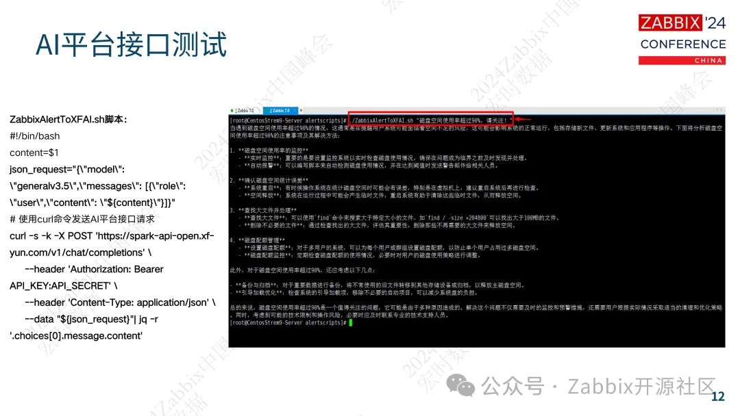 AI平台的配置和测试是实现Zabbix与AI结合的关键步骤。在峰会上,周松详细介绍了如何将Zabbix与AI平台进行集成。通过配置AI平台信息、功能测试以及接口测试,确保了Zabbix能够顺利地与AI平台进行通信,并利用AI的能力进行数据分析。