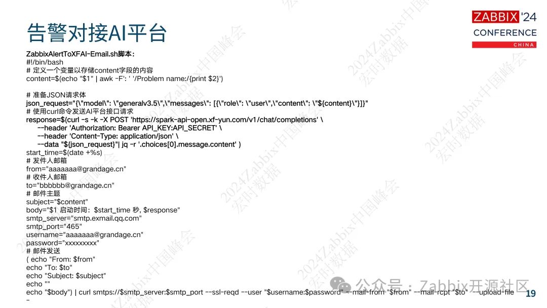 告警处理是监控系统中最为关键的环节之一。在Zabbix与AI的结合中,告警对接AI平台成为了一个新的亮点。通过告警脚本,如ZabbixAlertToXFAI-Email.sh,Zabbix能够将告警信息转化为AI平台能够理解的格式,并发送给AI平台进行分析。
