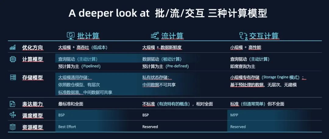 一体化是我们第一天就追求的设计方向。通过分析已有的批处理、流计算和交互分析三种计算范式,它们各自有自己的优化方向和设计模式,有不同的存储计算表达,无法彼此取代。具体的差异可以看下面这张表格。