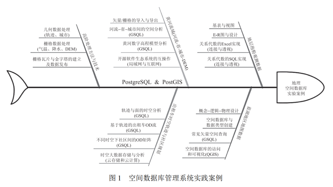 空间数据库是计算机科学与地理学的交叉领域。为了深入理解《空间数据库管理系统概论(第二版)》中的相关理论,《空间数据库实验教程》(以下简称本教程)是与之配套使用的实验教程。本教程设计了地层孢粉观测数据、蓝湖地区地图数据、黄河流域河流-省-城市-DEM数据、出租车时空轨迹与社区规划等系列实验案例,强化空间数据库理论与地理数据、概念和问题的联系,帮助读者在实践中理解和掌握相关概念和方法,如图 1 所示。