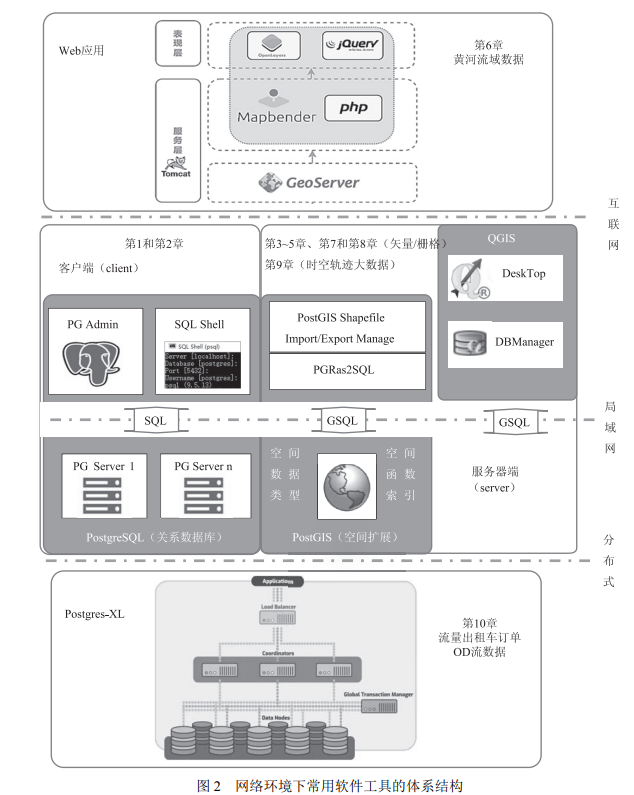 本教程的第二个特色是先在单机上部署系统,读者通过前 4 章的学习基本掌握了空间数据库管理系统的基础技术,如图 2 中间左部所示;然后,逐步将单机环境扩展到网络环境。扩展主要分为三步:首先,在局域网下基于两层软件架构实现远程数据库的访问,如图 2 中间右部所示,详见 5.2 节;其次,在互联网环境下基于三层架构实现空间数据库的 Web 环境的共享与发布,如图 2 上部所示,详见第 6 章;最后,面向时空大数据实现数据服务器端的分布式存储与计算,如图 2 下部所示,详见第 10 章。通过上述学习过程,让读者体会数据库从单机环境到云环境的过程。