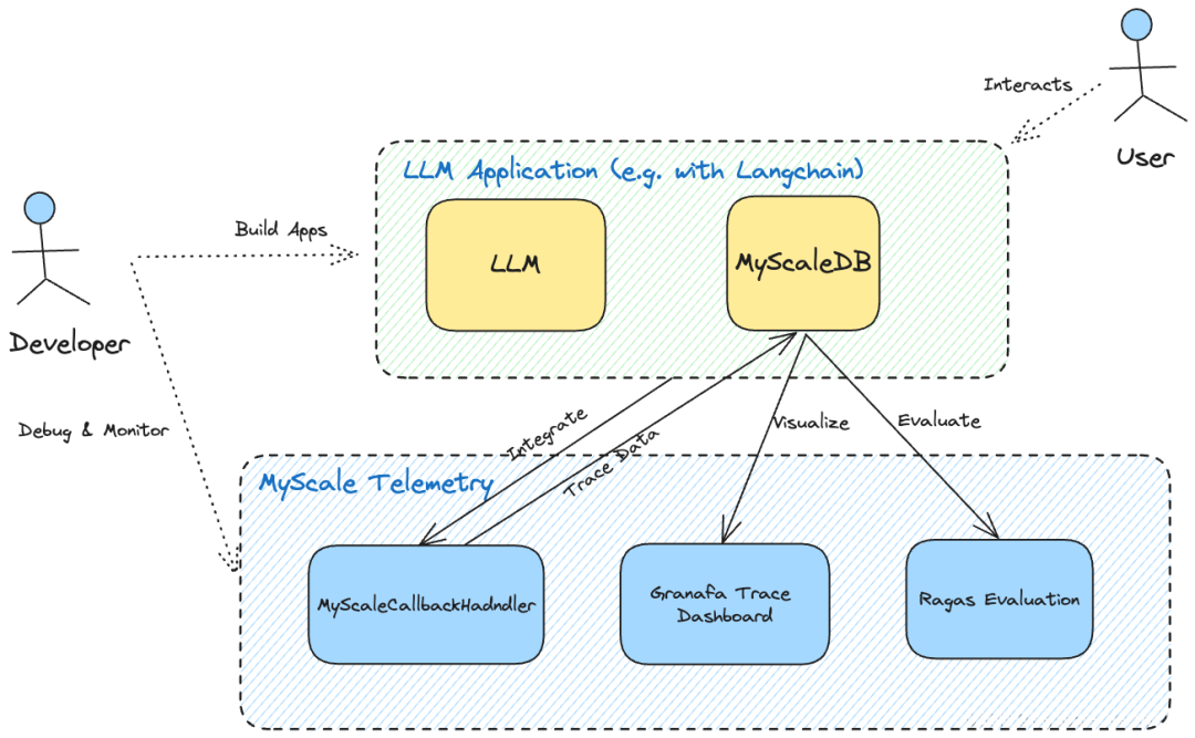 MyScale Telemetry 无缝地捕获基于 LangChain 的 LLM 应用程序的跟踪数据,并将其存储在 MyScale 中,使诊断问题、优化性能和理解模型行为变得容易。