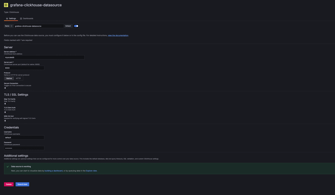 在 Grafana 数据源设置中添加一个新的 ClickHouse 数据源。服务器地址、服务器端口、用户名和密码应与使用的 MyScaleDB 的主机、端口、用户名和密码相对应。