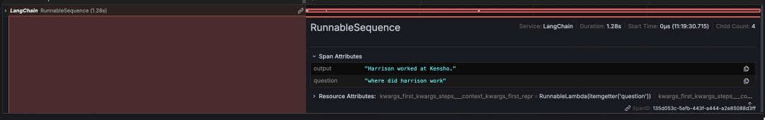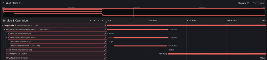 仪表板显示 LangChain 应用程序中每个函数的执行时间,帮助识别性能瓶颈。