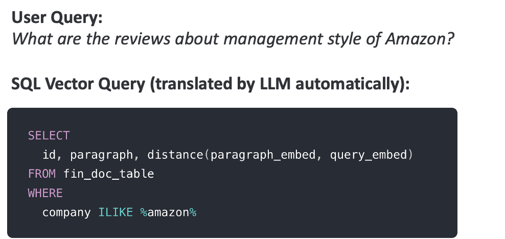 然而,如果我们事先知道与 <某公司> 相关的文档标题中包含了这个关键词,我们可以使用 WHERE title ILIKE '%<某公司>%' 进行预过滤,从而将搜索结果缩小为只包含相关文档。此外,LLM可以自动提取 <某公司>,例如作为函数调用中的参数或从查询文本生成 SQL WHERE 子句,确保系统灵活易用。