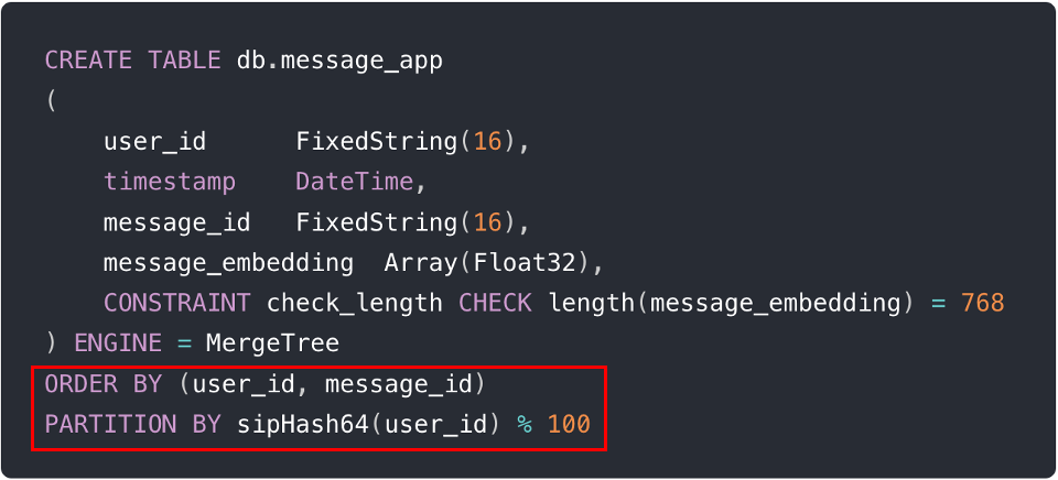 下面的图示描述了一个实际示例,展示了在表创建过程中使用两行 SQL 来实现这些技术(即 ORDER BY (user_id, message_id) 和 PARTITION BY sipHash64(user_id) % 100)。