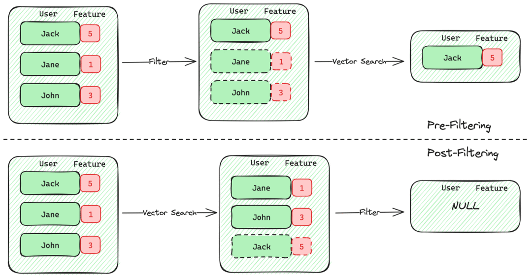 在过滤向量搜索中,实现元数据过滤有两种方法:预过滤和后过滤。