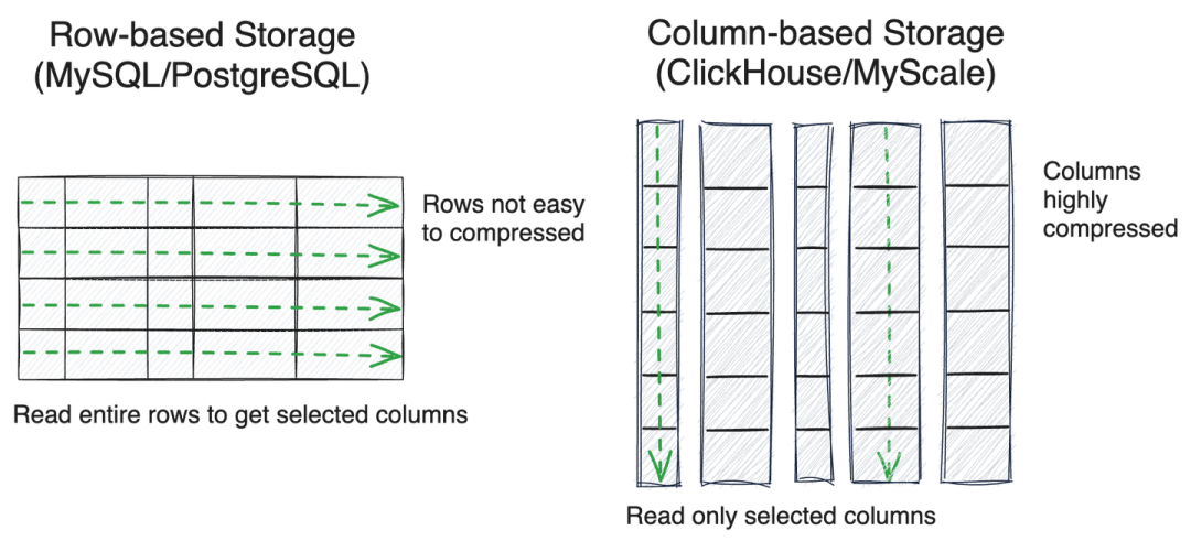 在采用预过滤策略时,高效扫描元数据对检索性能至关重要。数据库存储通常分为行存储和列存储两种类型。