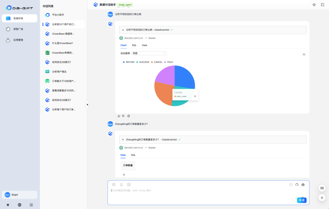 点击开始对话,输入对应的问题进行数据问答。