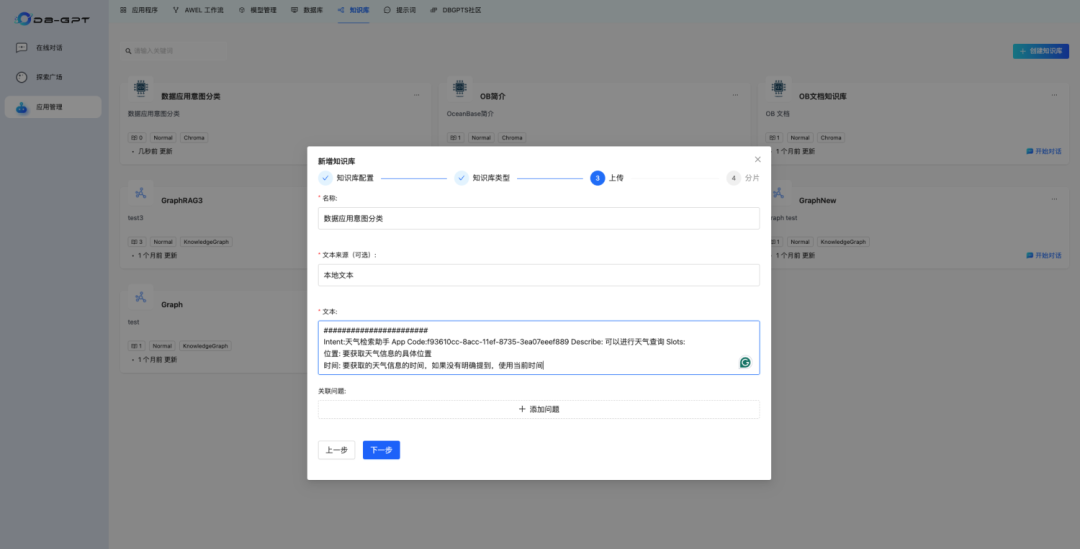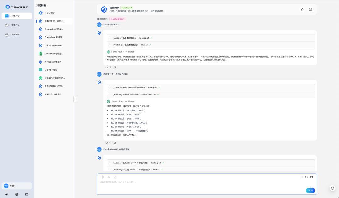 #######################Intent:DB答疑 App Code:a41d0274-8ac4-11ef-8735-3ea07eeef889 Describe: 所有DB领域相关知识的咨询答疑,包含了日常DBA的FAQ问题数据、OceanBase(OB)的官方文档手册,操作手册、问题排查手册、日常疑难问题的知识总结、可以进行专业的DBA领域知识答疑。只要和DB相关的不属于其他应用负责范畴的都可以使用我来回答 问题范例: 1.怎么查看OB抖动?2.DMS权限如何申请 3.如何确认xxxxx 类型:知识库咨询#######################Intent:数据对话 App Code:516963c4-8ac9-11ef-8735-3ea07eeef889 Describe: 通过SQL查询分析当前数据库(dbgpt-test:包含用户和用户销售订单数据的数据库) 类型:数据查询#######################Intent:天气检索助手 App Code:f93610cc-8acc-11ef-8735-3ea07eeef889 Describe: 可以进行天气查询 Slots:位置: 要获取天气信息的具体位置时间: 要获取的天气信息的时间,如果没有明确提到,使用当前时间