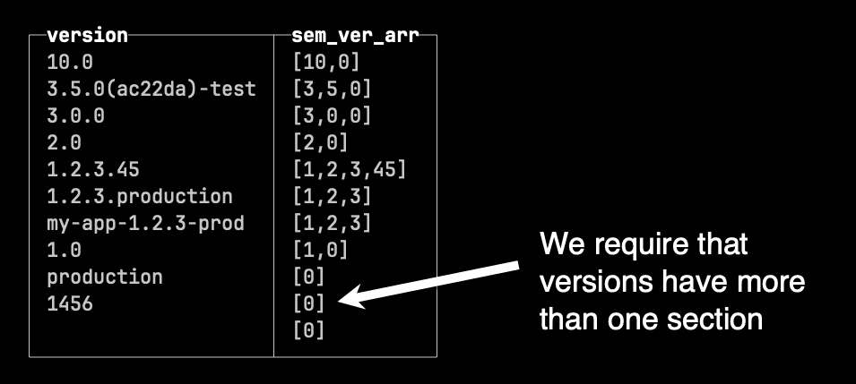 SELECTversion,sortableSemVer(version) AS sem_ver_arrFROM(SELECT ['1.0', '2.0', '3.0.0', '10.0', 'production', '1.2.3.production','my-app-1.2.3-prod', '3.5.0(ac22da)-test', '1456', '1.2.3.45', ''] AS version)ARRAY JOIN versionORDER BY sem_ver_arr DESC