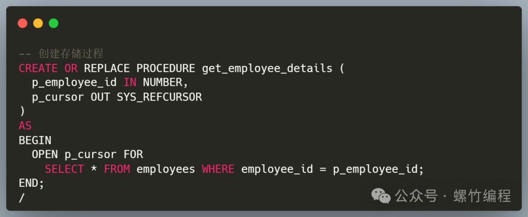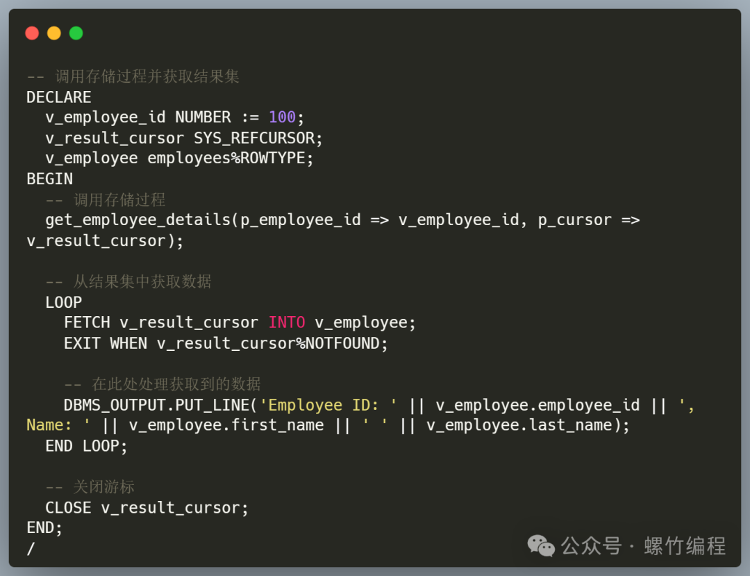 最后,我们关闭了游标,结束了存储过程的调用和处理。