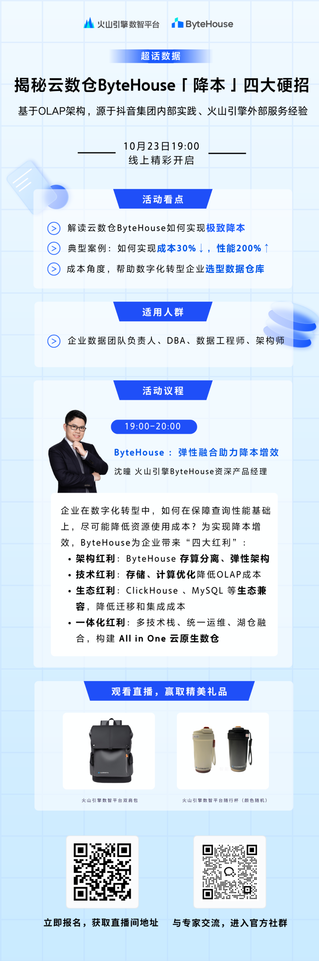 10月23日19:00,ByteHouse将围绕“降本增效”话题,总结抖音集团及金融、游戏等外部行业经验,从架构、技术、生态、一体化四个方面,揭秘ByteHouse实现“效率与成本”双赢。