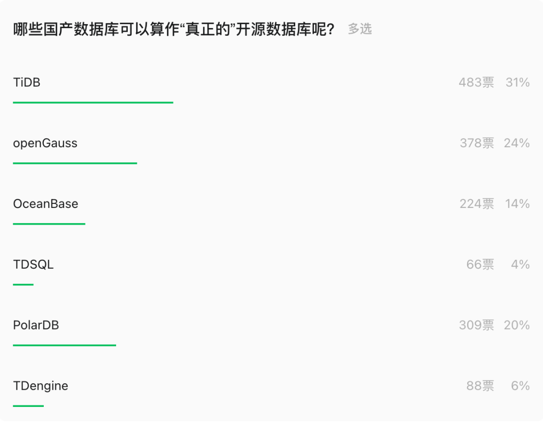 投票结果的前三名:TiDB(483票,31%)、openGauss(378票,24%)、PolarDB(309票,20%)。
