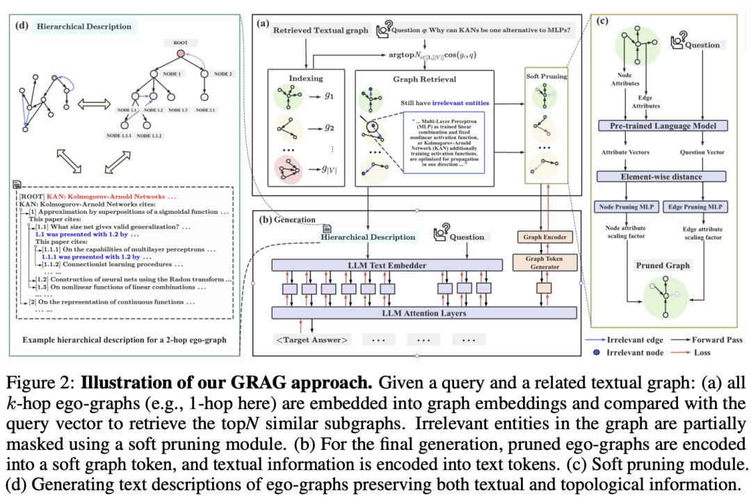 分层描述生成 (Hierarchical Description):在最终阶段,剪枝后的子图会被转化为分层的文本描述。这些描述同时保留了文本和图的拓扑信息,形成层次化的结构,反映出图的多跳推理逻辑。通过这种分层策略,系统能够从子图中提取出结构化的文本信息,从而保证生成的回答既上下文连贯,又在图结构上保持一致。