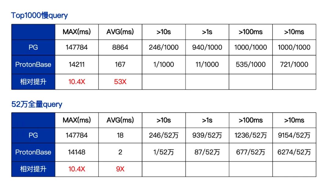 ProtonBase 在该场景下,相对于 PostgreSQL 有明显的性能优势。下图是在 ERP 一个物流场景下的性能对比,根据线上一个时间范围内的查询日志,使用同样的数据在 ProtonBase 同资源规格下进行性能测试。从统计结果可以看出:1. 在全量查询下,最慢的 query 查询性能从 147 秒提升到了 14 秒,是原来的 10.4 倍。2. 在全量查询下,query 的平均查询性能从 18 ms 提升到了 2 ms,是原来的 9 倍。3. 在原来的 top1000 的慢 query 范围内,平均性能从 8864ms 提升到 167ms,是原来的 53 倍。原因主要是慢 query 主要是 OLAP 的分析型 query,在该场景下 ProtonBase 有良好的查询性能。