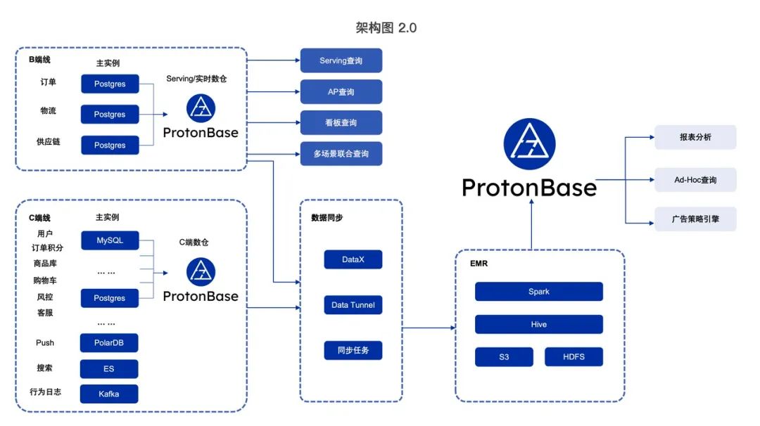 导读:近年来,跨境电商市场规模迅速扩大。根据中商产业研究院发布的《2022-2027 年中国跨境电商市场需求预测及发展趋势前瞻报告》显示,2024 年中国跨境电商市场规模将达 17.9 万亿元。在数字化浪潮下,数据已成为企业核心资产。然而,如何高效利用海量数据仍是诸多公司面临的挑战。本文将分享某跨境电商借助 ProtonBase 解决数据孤岛问题的同时释放数据价值的实践经验。本文结构如下:1. 业务背景:数据产品在跨境电商运营中的重要性与日俱增3. ProtonBase 在该跨境电商多条业务线的应用该客户是一家跨境出海电商品牌。作为一家新兴的跨境电商公司正在迅速崛起,目前在全球各社交媒体上已积累数十亿次曝光,覆盖来自 100 多个国家的消费者,在全球已有超过 200 万的粉丝。该跨境电商的商业模式是通过自营和平台两种方式开展业务。自营业务方面,公司直接采购国内厂商的产品,通过自建的海外仓库网络,高效地将商品配送至世界各地;平台业务则是为国内商家提供一站式的跨境出口服务,包括物流、清关、本地化运营等环节。对于这样的跨境电商公司而言,数据库和数据仓库产品在其业务运营中扮演着至关重要的角色。不论是在面向 ERP 场景,C 端用户场景,亦或者根据产品的销售信息进行分析的大数据场景,处处都需要高效稳定且性能强大的数据产品来支撑。