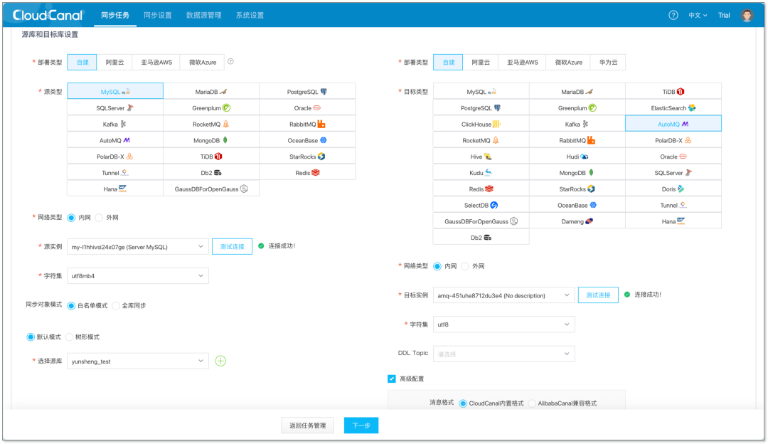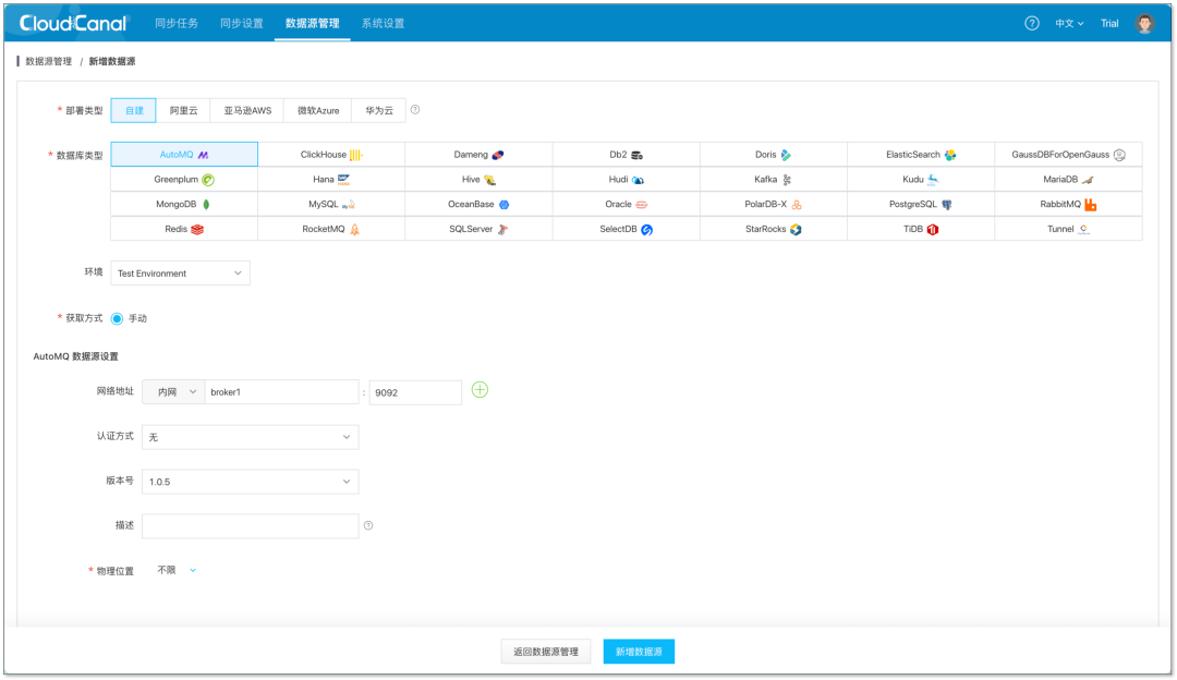 登陆 CloudCanal 平台,选择 数据源管理 -> 新增数据源。 将源端 MySQL 和目标端 AutoMQ 分别添加;Docker 创建的 AutoMQ 集群,网络地址填写 broker1:9092 或 broker2:9092。