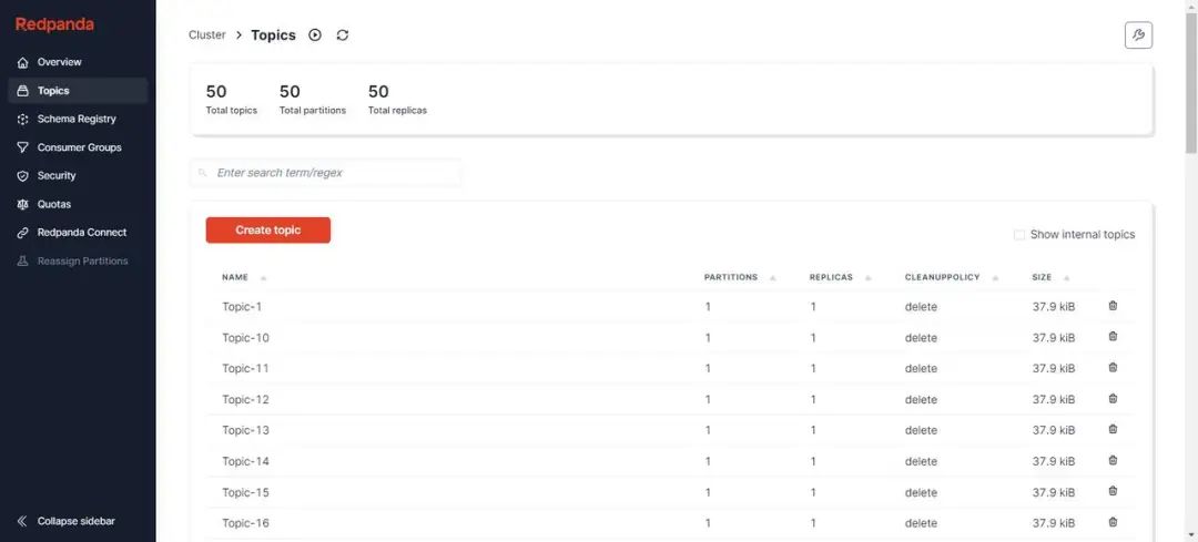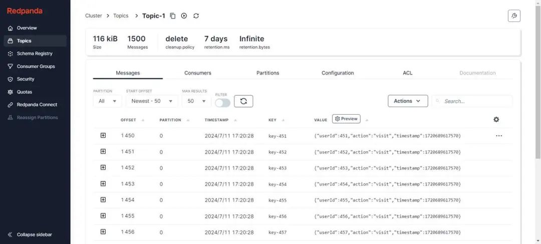 创建完成后,可以通过各种可视化工具查看 Kafka 节点状态,比如 Redpanda Console [9]、Kafdrop [10] 等。这里我选择 Redpanda Console,可以看到当前已经有了 50 个Topic,并且每个 Topic 下有500条初始消息。