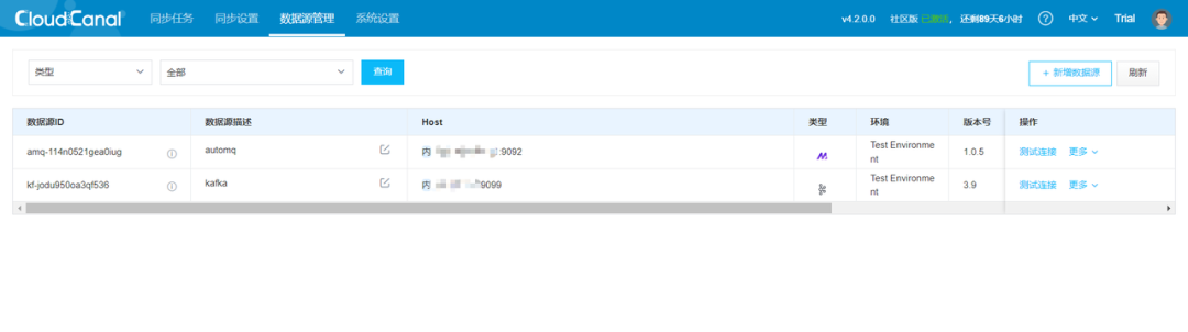 同理增加 Kafka 数据源,并对两个节点都进行连接测试,可以得到如下结果: