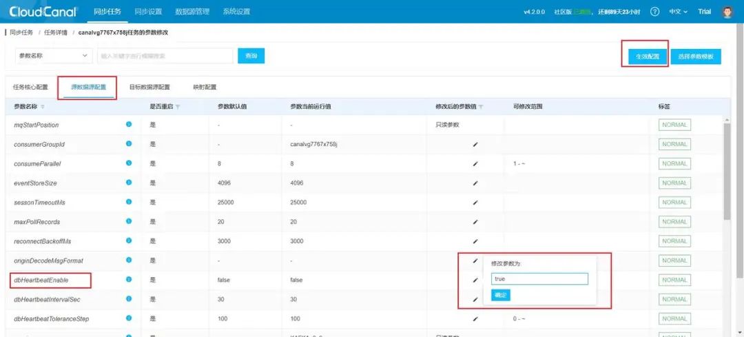 5. 任务创建完成后默认自动启动,会跳转到任务列表,你还需要更改源数据源配置以开启心跳配置,能及时更新任务状态,步骤为 任务详情->源数据源配置->修改配置->生效配置: