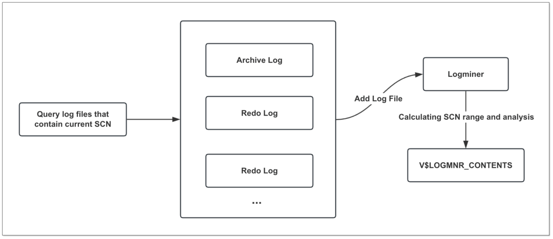 获取所有包含当前 SCN 位点的 Redo 或 Archive 日志文件,并添加到 Logminer 中 计算本次需要分析的 SCN 范围(START_SCN, END_SCN) Logminer 对于 SCN 范围进行日志分析,分析结果展现在 V$LOGMNR_CONTENTS 视图中 扫描 V$LOGMNR_CONTENTS 视图,转换处理后同步到目标端