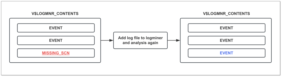 Logminer 分析 Redo 日志时,由于日志切换或其他特殊情况,导致部分 SCN 事件没有被 Logminer 分析到,因此在 V$LOGMNR_CONTENTS 视图中体现为 MISSING_SCN。