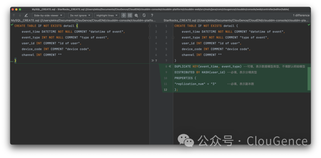 其次我们来看下 StarRocks 明细模型的标准建表语句与 MySQL 的差异: