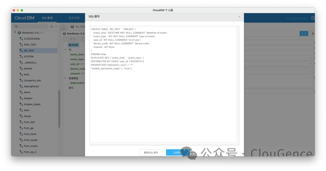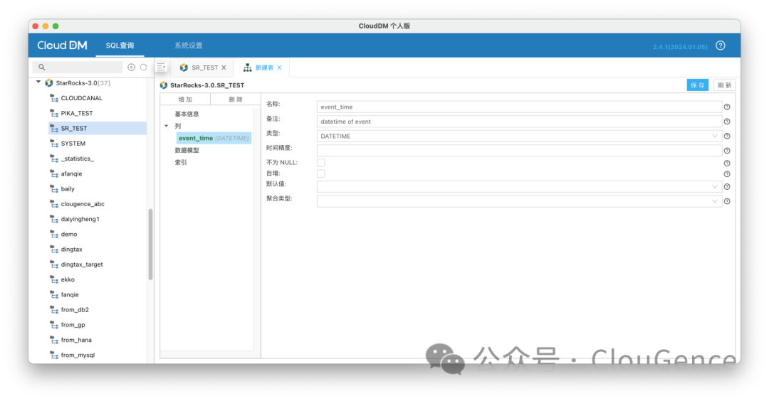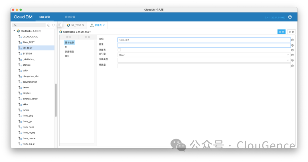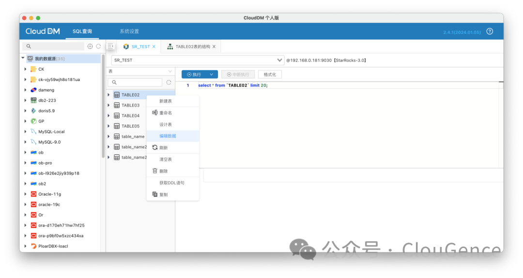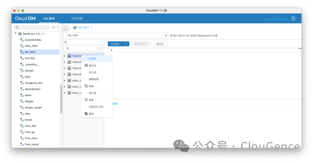 使用 CloudDM,添加完 StarRocks 数据源之后,在表视图中右键方式开始新建表操作: